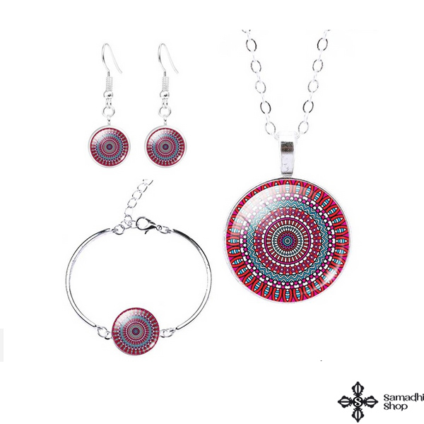 3 részes bizsu szett sematikus „mandala” mintával: karkötő + nyaklánc + 1 pár fülbevaló.