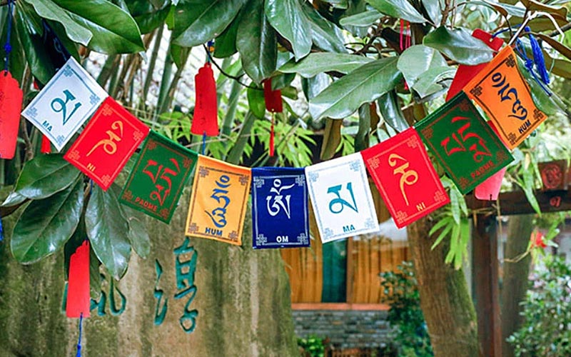 10 zászlólapot tartalmazó csomag, összesen kb 1 méter hosszú Om Mani Padme Hum imazászlót tartalmaz.