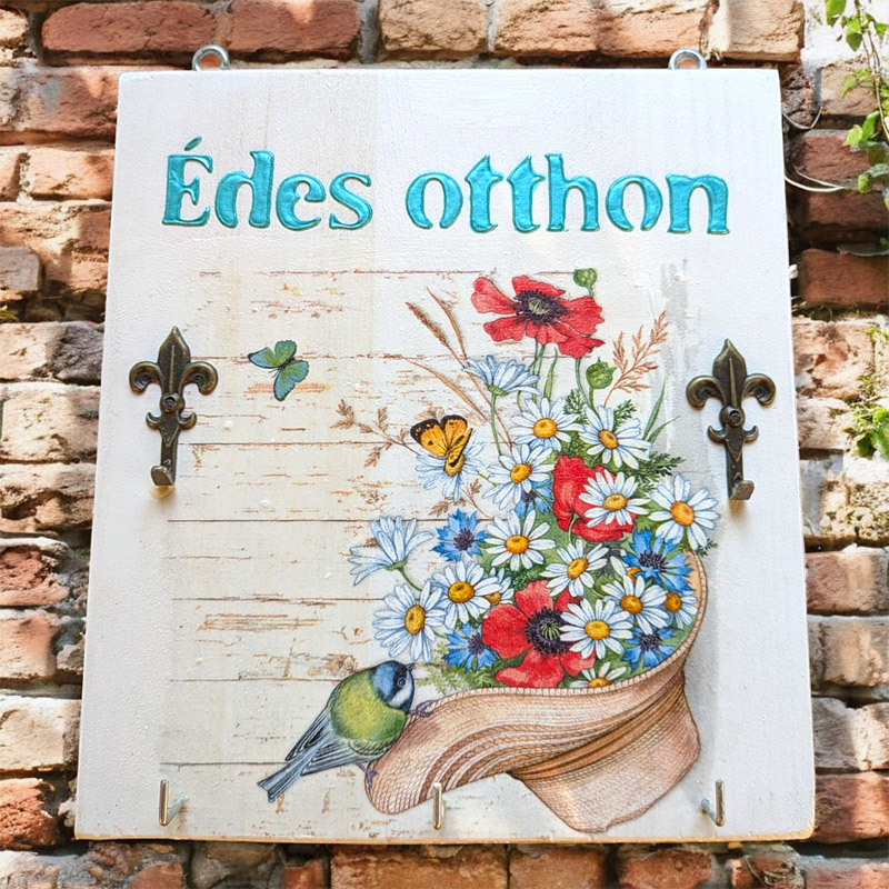 Egyedileg alkotott, kézműves, Édes Otthon feliratos kulcstartós falikép. Szöggel vagy csavarral 2 ponton a falhoz rögzíthető, vagy akasztható, amihez 2 akasztó van a faliképen.