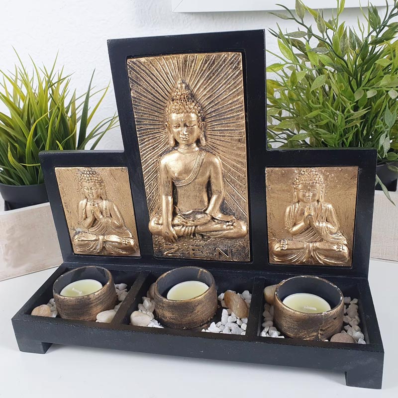 Különleges, nagy méretű tripla mécsestartós oltár, Buddha képekkel díszítve. A csomaghoz mellékelve vannak a képen látható mécsestartók, apró díszkövek és mécsesek is.